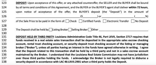 If the deposit will not be held by a brokerage (which has standards different from those of third parties), the buyer and seller must sign off stating that they have read and understood these terms. The Louisiana Real Estate Commission no longer has jurisdiction over these funds. If there is a dispute and both parties acknowledge it, the brokers are not required to release a deposit held by this third party.