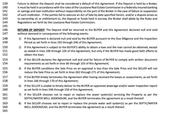 The most noteworthy lines (lines 97-100) require the buyer to provide the seller with written proof from their lender that the buyer has applied for their loan and authorized their lender to proceed with the loan approval process. Typically, in the New Orleans area, the buyer will be granted 5-7 days to obtain this.
