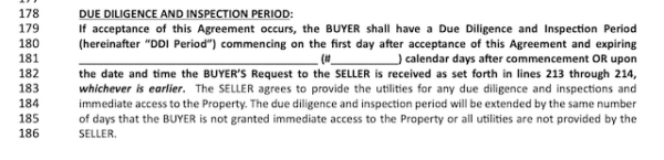 NOTE: If the buyer is dissatisfied with the inspection results but fails to either provide the seller with a list of deficiencies or cancel the contract in writing within the due diligence period, then they will have effectively accepted the property in its current condition. The seller is not required to make any repairs other than those agreed upon in writing.