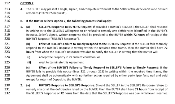 If the seller chooses not to make any repairs or provide credits (or only agrees to some of the items) asked for, the buyer may then, within 72 hours of the seller’s response: