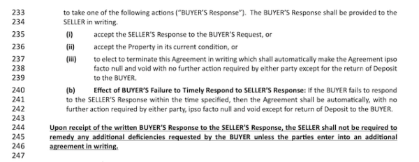 If the buyer does not write their reply to the seller’s response, the contract is then null and void. The buyer is still entitled to their deposit being returned.