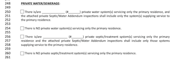 This excerpt covers any private water or sewage. If there is a septic tank, private treatment system, or private water system, it must be indicated here.