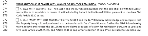 - Sale with warranties occurs when the seller personally warrants the property’s condition or, in other words, affirms that they will be liable for any defects discovered in the property. It is very unusual for a seller to agree to a sale with warranties, and it is not customary in Louisiana.