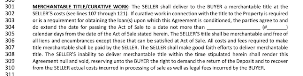 If issues with the title are discovered during the title examination, both parties agree to extend the closing day by the negotiated number of days so that the necessary curative work can be done to clear the title. This extension period typically ranges from 15 to 45 days, but the parties can agree on any length of time.