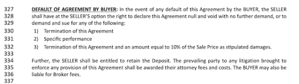 This section details what happens if the buyer or seller defaults on the contract.