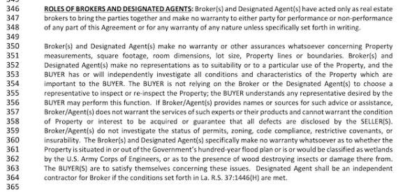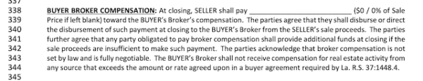 This is a new section of the Louisiana Residential Agreement to Buy or Sell, as of 2026. It outlines what dollar amount or percentage of the sales price that the seller will pay towards the buyer’s agent’s commission. It also acknowledges that this amount is not set by law and is fully negotiable.