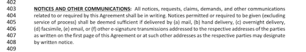 This portion discusses the communication of the contract. All notices, demands, changes, or anything related to the contract must be in writing.