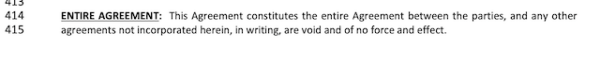 This section of the Louisiana contract states that this document constitutes the entire agreement between the buyer and the seller. Any other agreements not included in this contract are void and unenforceable.