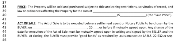 The “act of sale” or closing date for this sale is agreed upon from lines 42 through 45. You agree that the buyer can bring funds and purchase the property from the seller by this date. A notary public or settlement agent must do this. Most homebuyers choose to use a reputable title company to conduct the act of sale. The property purchaser decides which company or person will handle the closing.